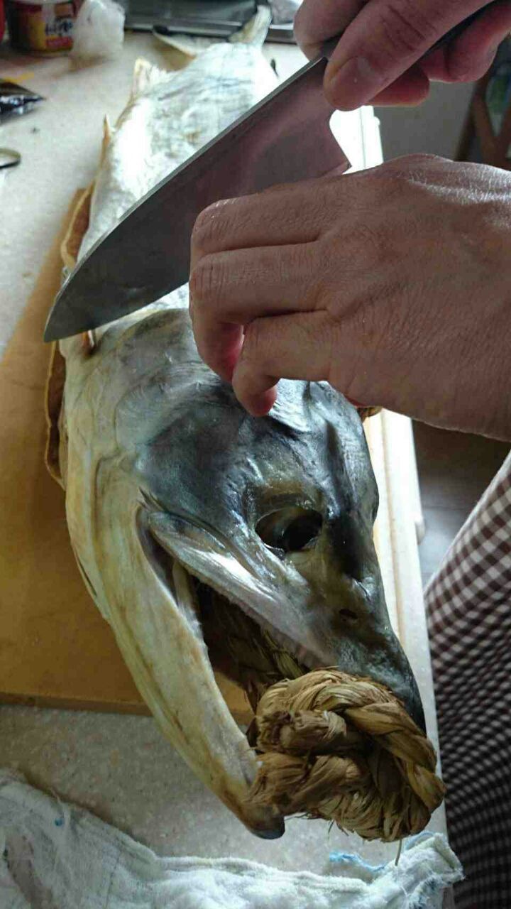 そのしょっぱい鮭の首に縄をかけ、つるして浜の風で干したものが“寒風干し“と呼ばれるものです。