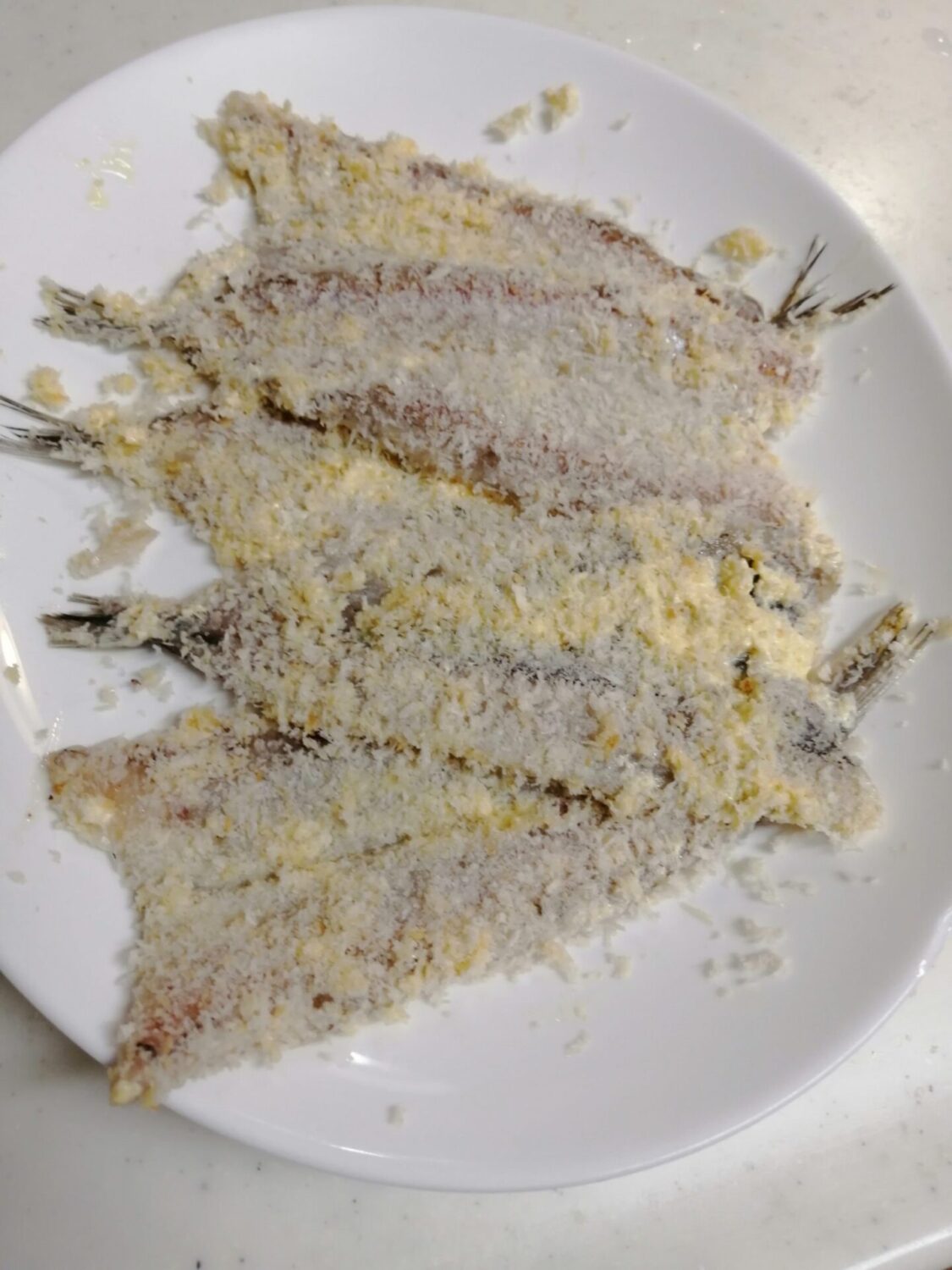 頭と内蔵を取って、唐揚げ粉をつけ、フライパンで揚げ炒めします。